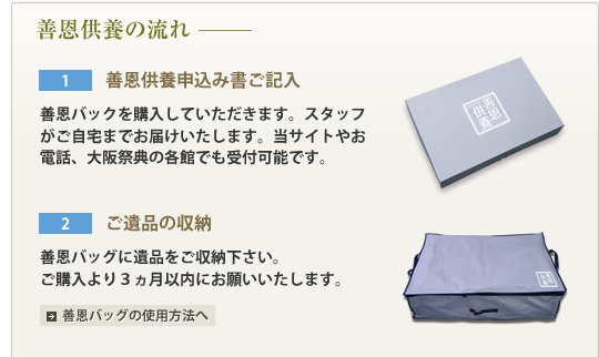 大阪祭典のアフターサービスの1つとして、供養品収集袋「善恩バッグ」を販売いたします。 善恩供養(ぜのんくよう)とはただ単に収集バッグを販売するのでは無く、大切な方の想い出の品々を納めて頂いた後バッグをお引取りに伺い、 当社指定のご寺院により手厚いご法要をさせて頂きます。 ご法要後、お客様の元に法要証明書を発送させて頂きます。